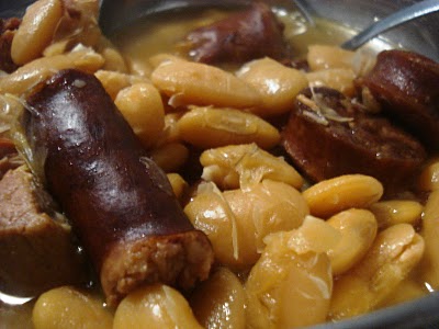 Coloque as favas num prato coberto com os chouriço cortados ás rodelas e o toucinho.